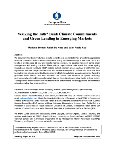 EBRD documents how banks' voluntary climate commitments predict both their green lending practices and their borrowers' environmental investments. Using structured surveys of 644 bank CEOs and heads of credit across 33 low- and middle-income countries, EBRD develops indices of banks' green management and lending practices. These unique organizational data reveal that banks signing international climate initiatives (`talk') indeed exhibit stronger green practices (`walk') than non-signatories.